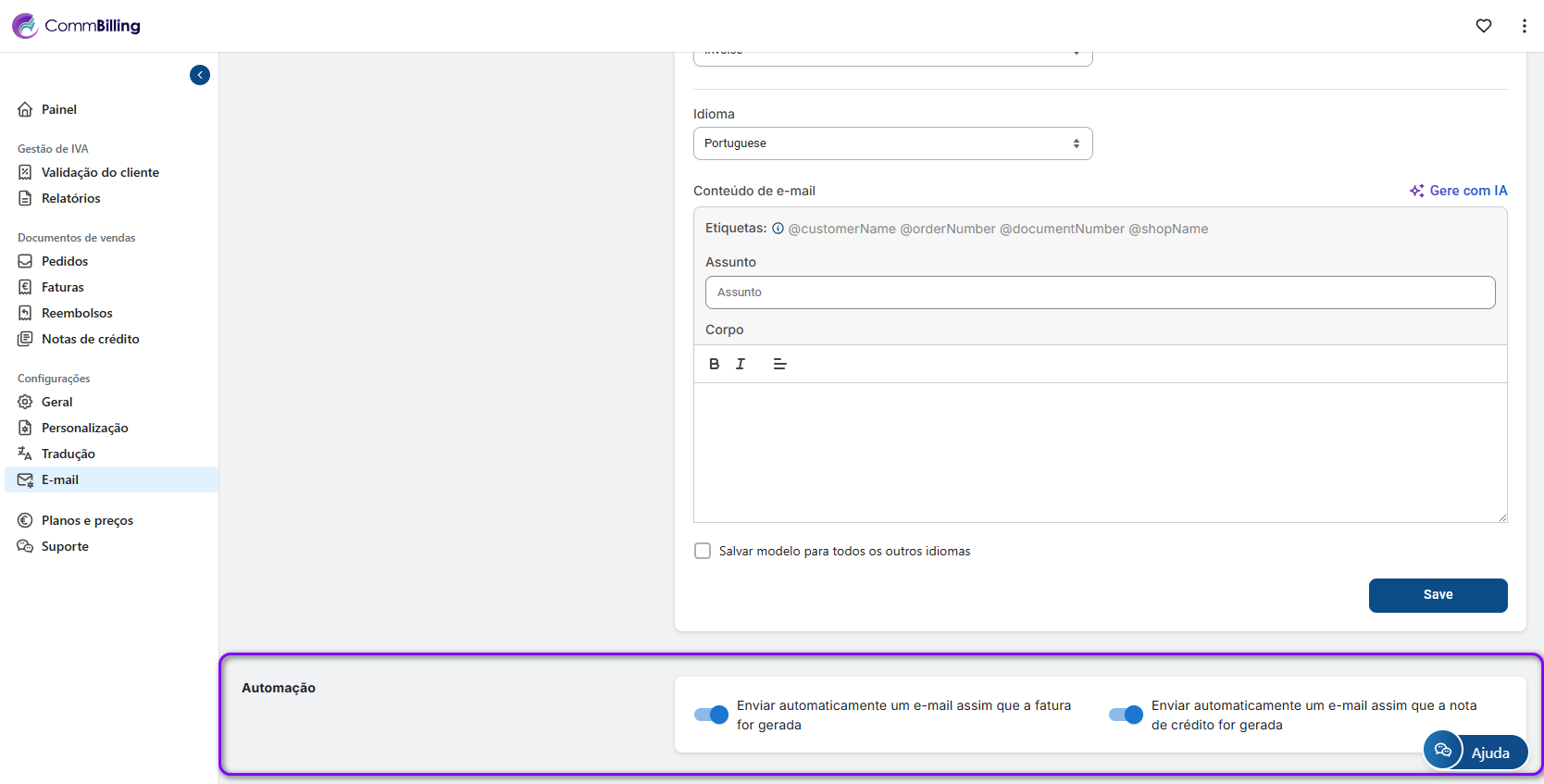 A comunicação atempada é fundamental para a satisfação do cliente. Com o CommBilling, pode automatizar notificações por e-mail sempre que uma fatura ou nota de crédito é gerada, eliminando o esforço manual e garantindo uma experiência perfeita para si e para os seus clientes. Esta automação mantém os clientes informados, poupando tempo para a sua empresa.