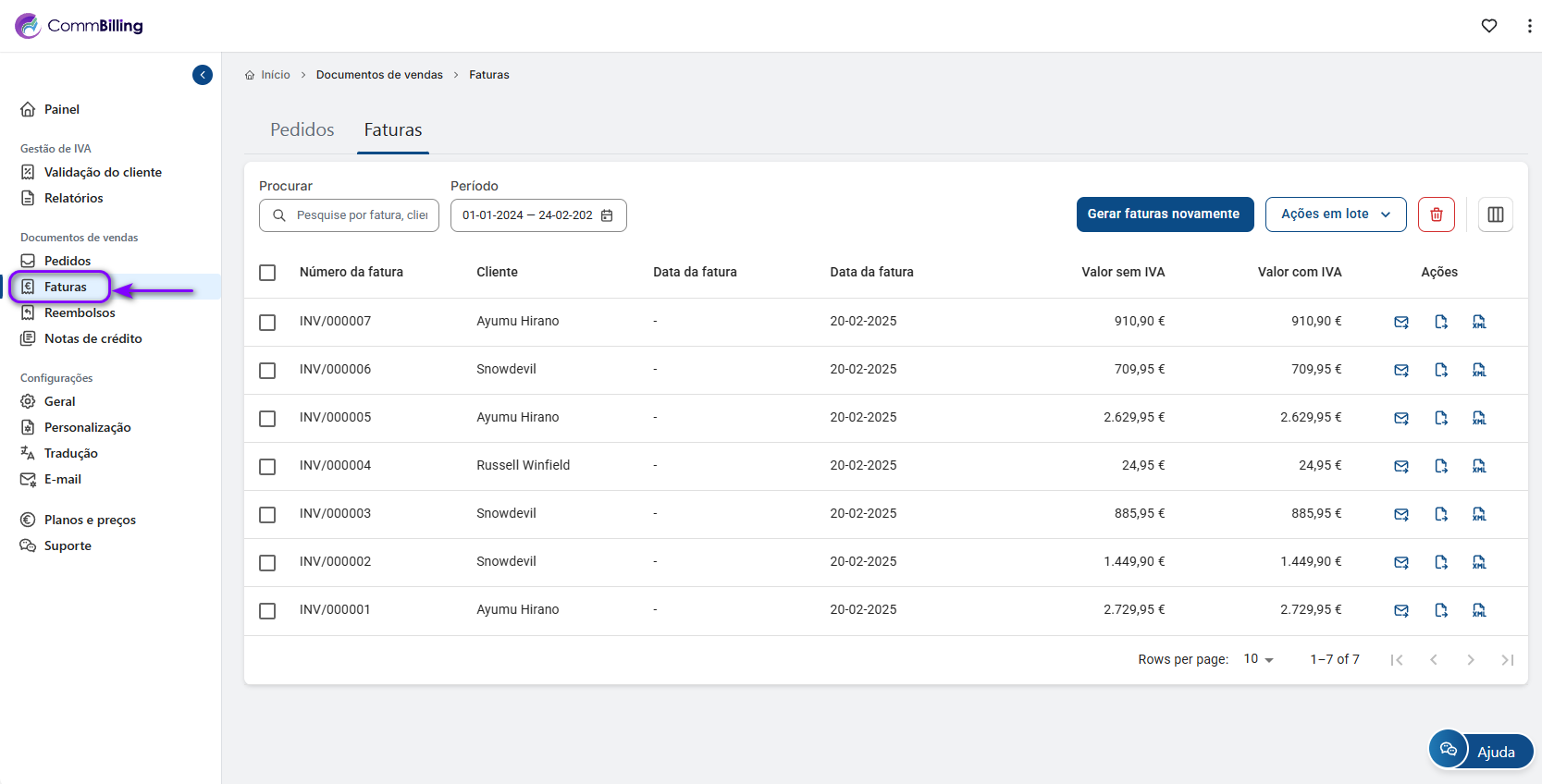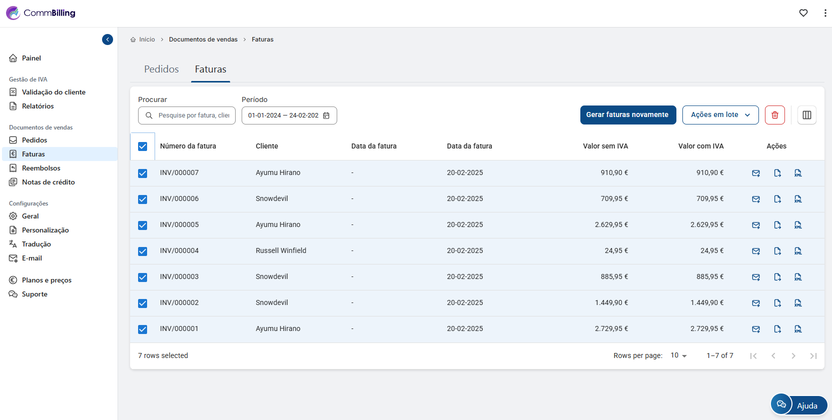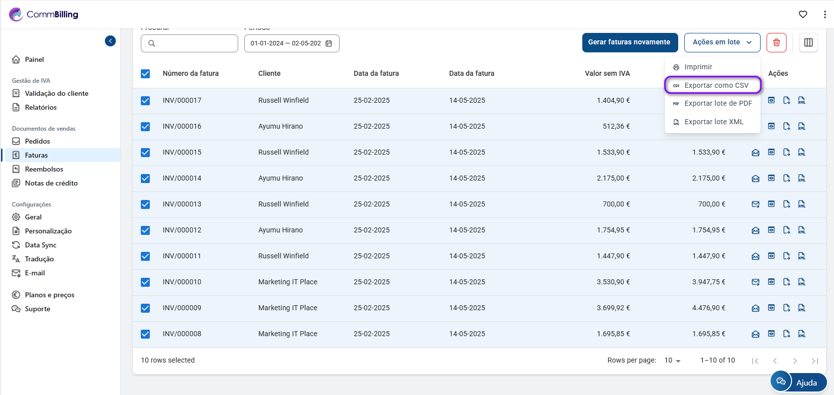 O CommBilling irá gerar e descarregar automaticamente um ficheiro CSV com as faturas selecionadas.