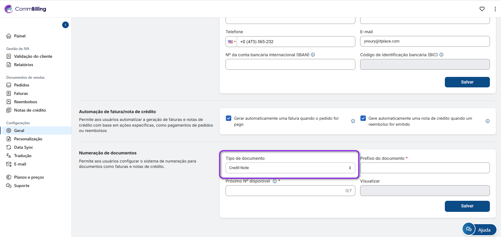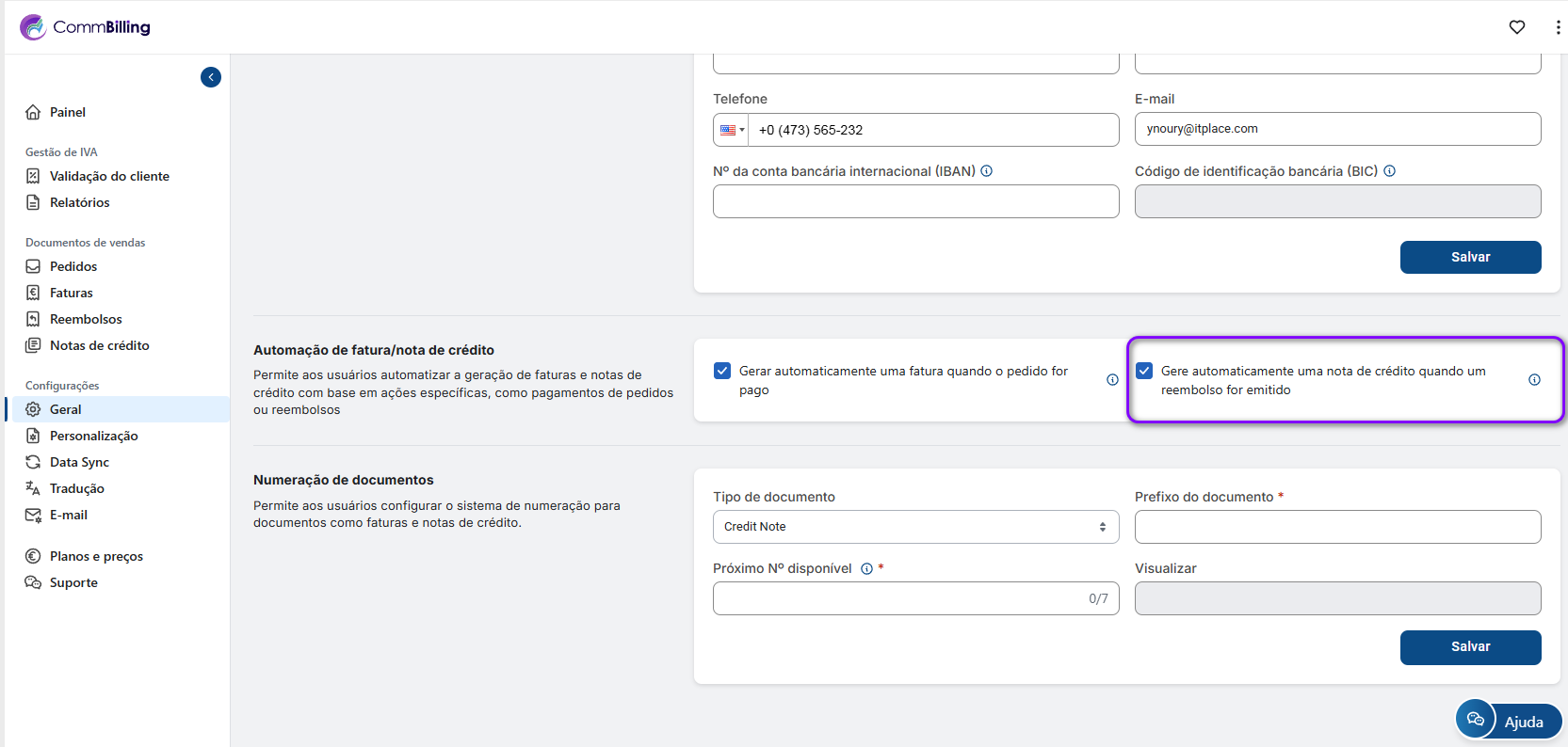 - Vá para as configurações gerais do CommBilling, seção "Automação de Faturas / Notas de Crédito".
