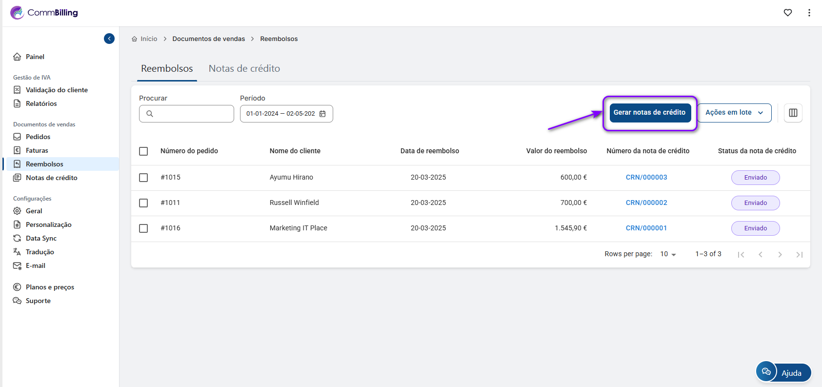 - No CommBilling, navegue até a seção "Documentos de Venda", aba "Reembolsos".