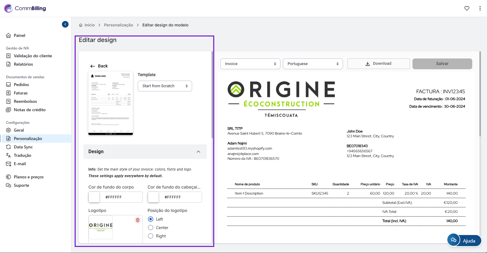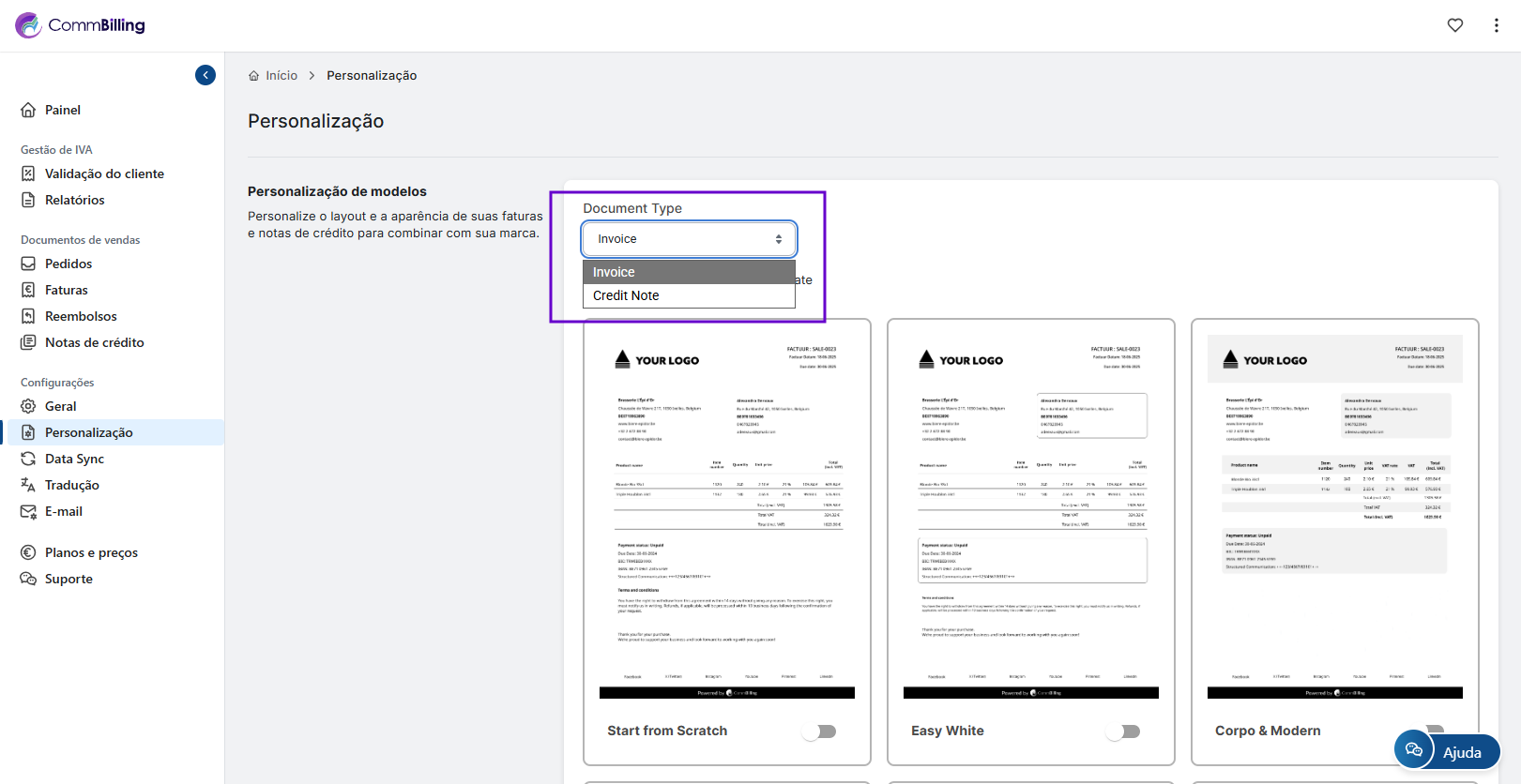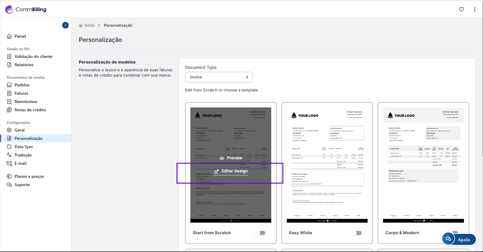 O CommBilling oferece opções de design flexíveis para que possa ajustar cores fontes campos e elementos de branding garantindo que cada documento que envia seja profissional e alinhado com a sua marca.