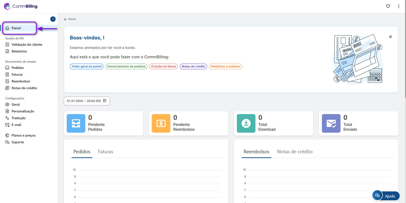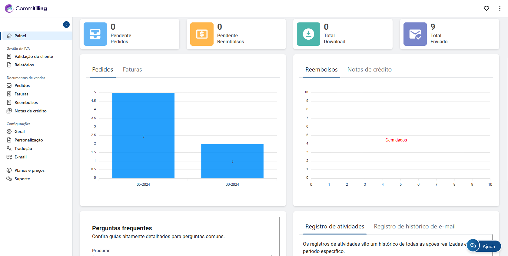 O CommBilling permite-lhe monitorizar o número de faturas geradas no mês corrente diretamente do painel de controlo.