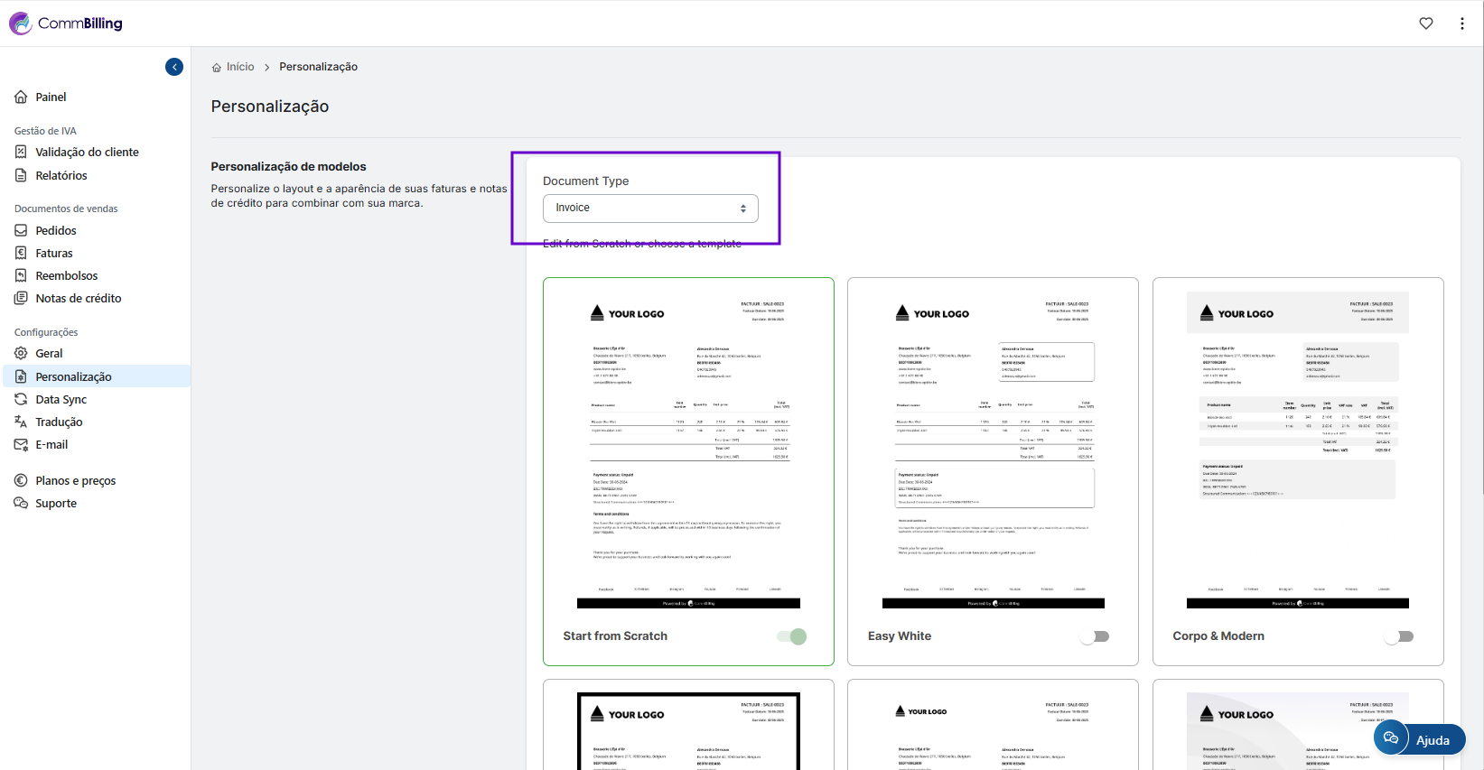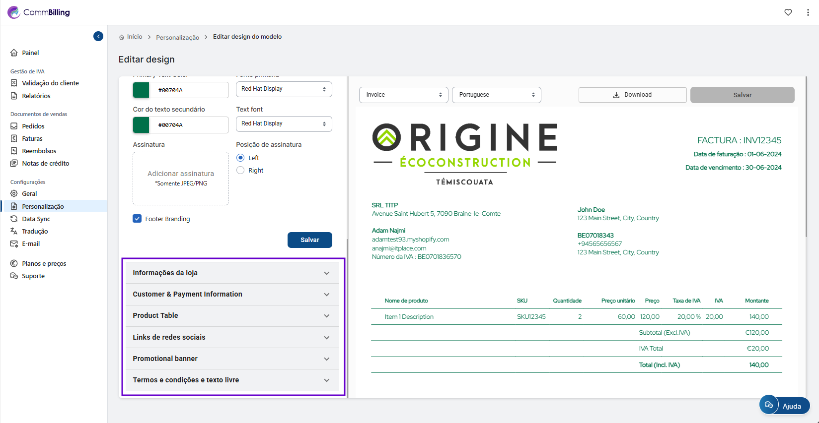 Ao gerir os campos que aparecem nas suas faturas garante que os seus documentos permanecem relevantes claros e profissionais. O CommBilling oferece lhe a flexibilidade de adaptar cada fatura às necessidades da sua empresa mantendo ao mesmo tempo uma imagem de marca consistente em toda a comunicação com os clientes.