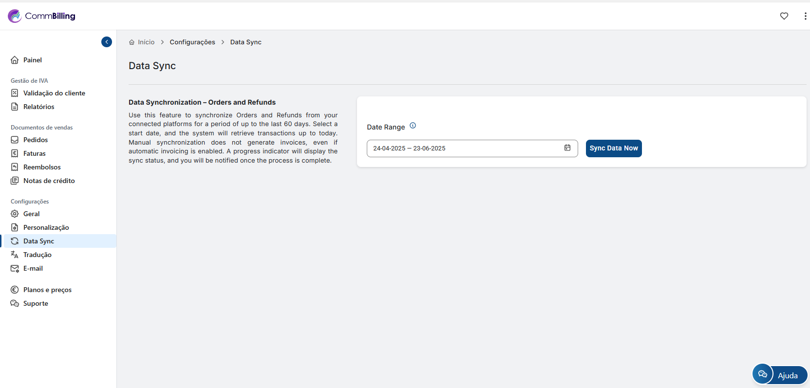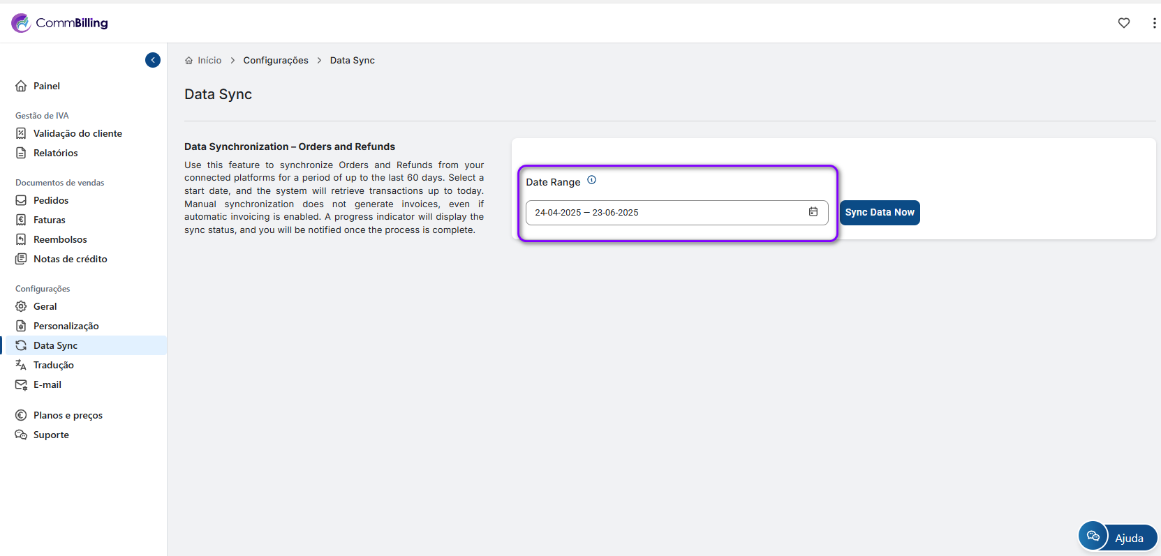 Essa função é especialmente útil durante o onboarding, ao testar sua configuração de faturação ou em caso de atrasos na integração. Ela foi projetada para garantir que seus dados históricos, de até 60 dias atrás, estejam totalmente alinhados, sem a necessidade de esperar pelo próximo ciclo de sincronização automática.
