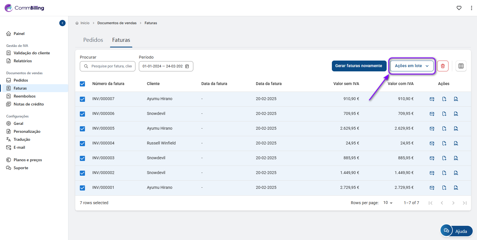- Utilize as caixas de verificação junto a cada fatura para selecionar as faturas que pretende processar em lote. Pode também utilizar filtros (como intervalo de datas ou estado) para restringir a sua seleção para uma gestão mais fácil.