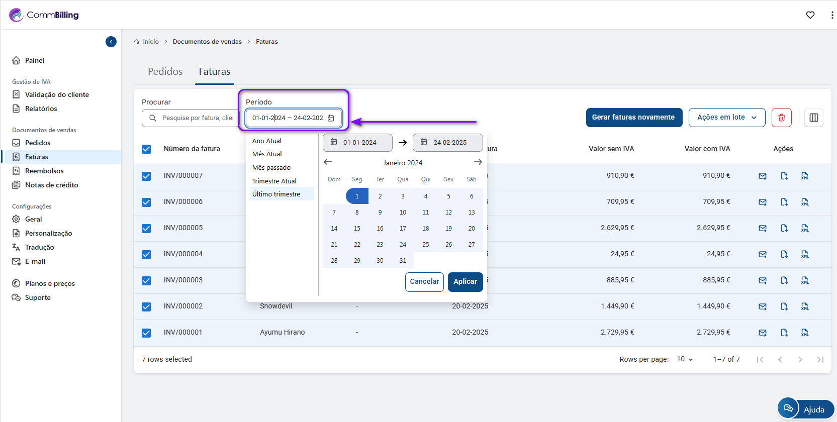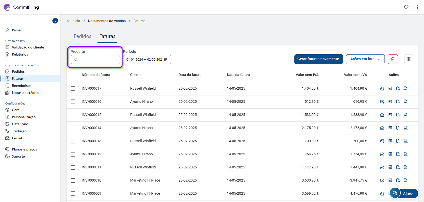 Ao utilizar os filtros de pesquisa e data na secção Faturas, pode localizar e gerir rapidamente faturas passadas no CommBilling. Isto ajuda a otimizar o seu fluxo de trabalho e garante um acesso fácil a registos financeiros importantes.