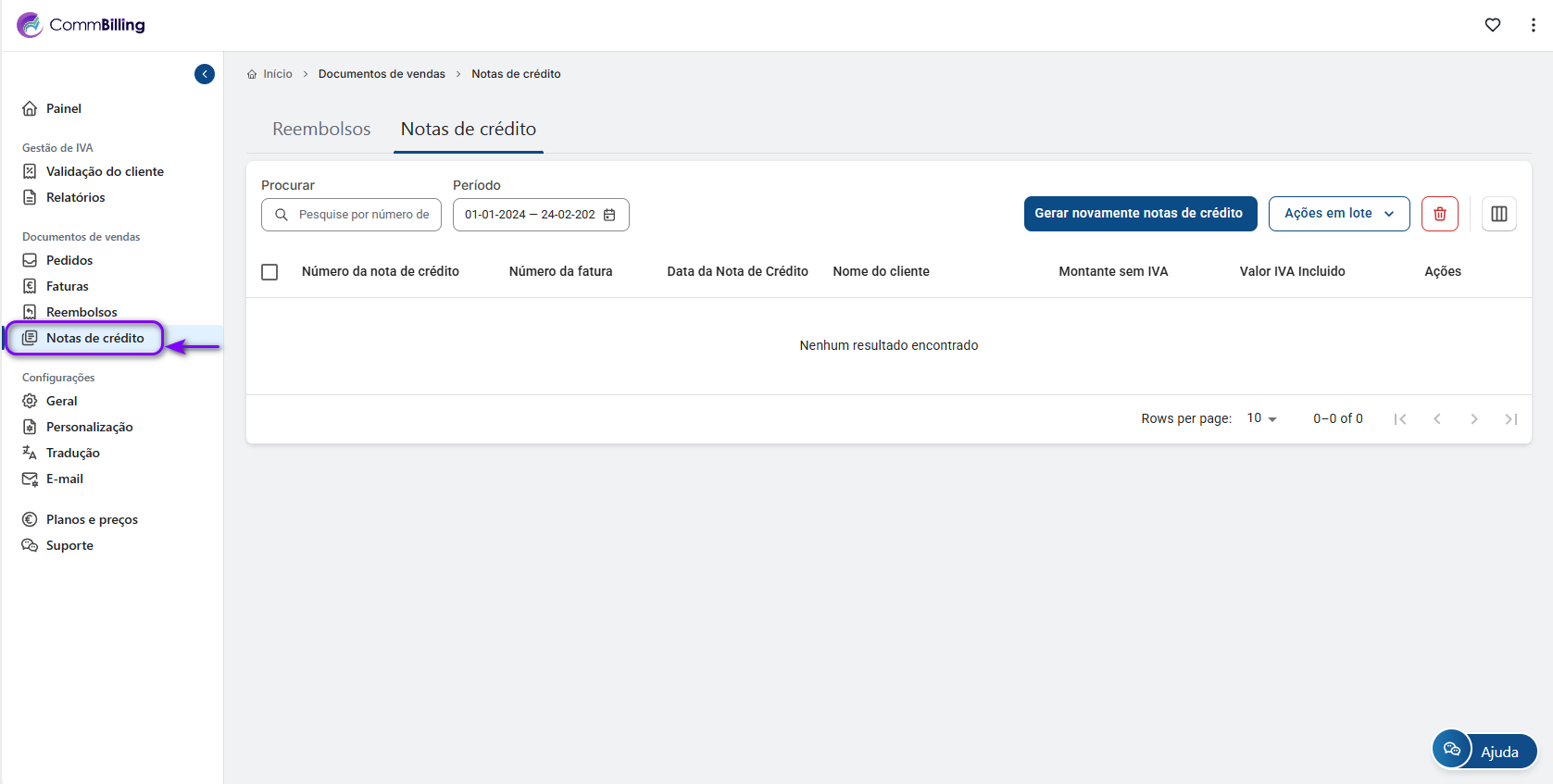 Também tem acesso direto ao separador Notas de Crédito a partir daqui.