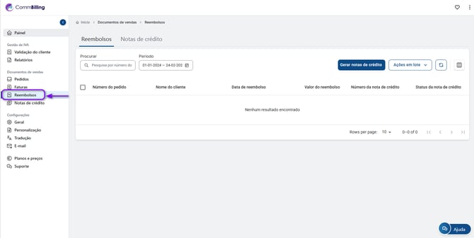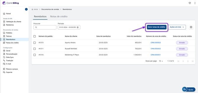 - Ações em Lote: Exporte detalhes de reembolso para um ficheiro CSV ou imprima-os.