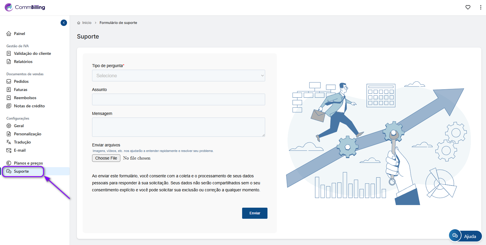 O Separador de Suporte no CommBilling fornece uma forma fácil para os utilizadores contactarem diretamente a equipa de suporte. Quer necessite de ajuda para resolver um problema ou pretenda fornecer feedback, esta secção foi concebida para tornar a obtenção de assistência direta e eficiente.