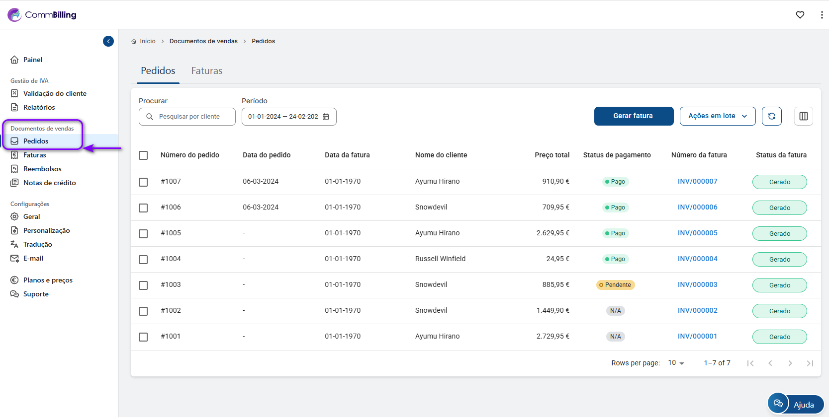 - Execute ações em várias encomendas simultaneamente, como gerar faturas ou exportar dados de encomendas.