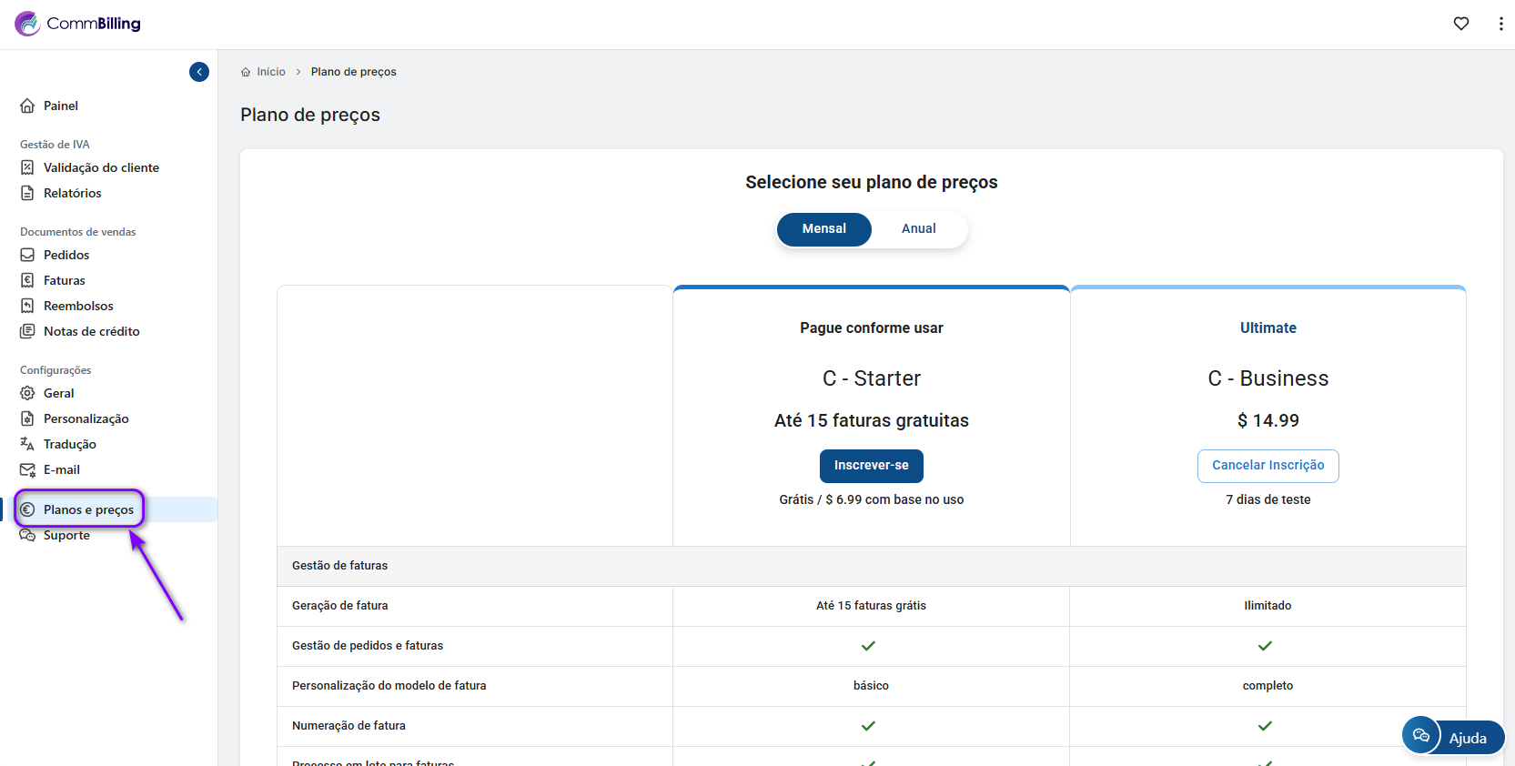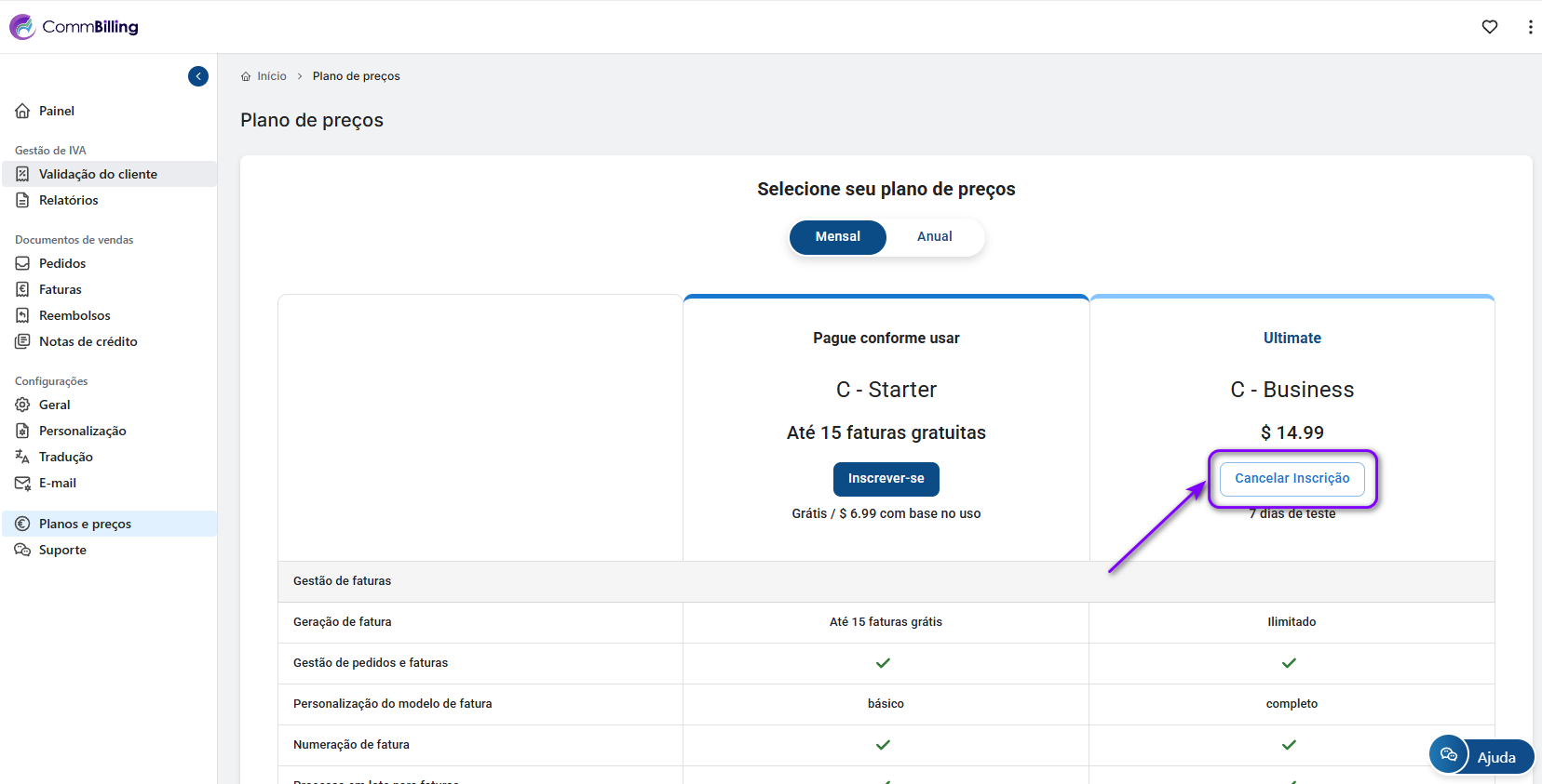 Se voltar a subscrever o Plano C-Business, o período de teste gratuito deixará de estar disponível e as cobranças começarão imediatamente após a subscrição.