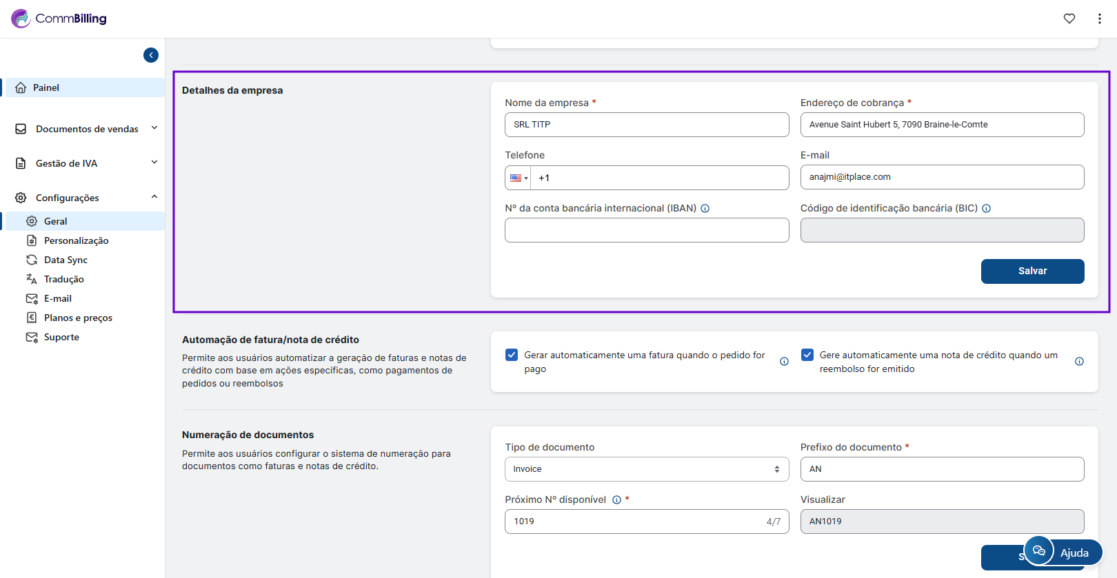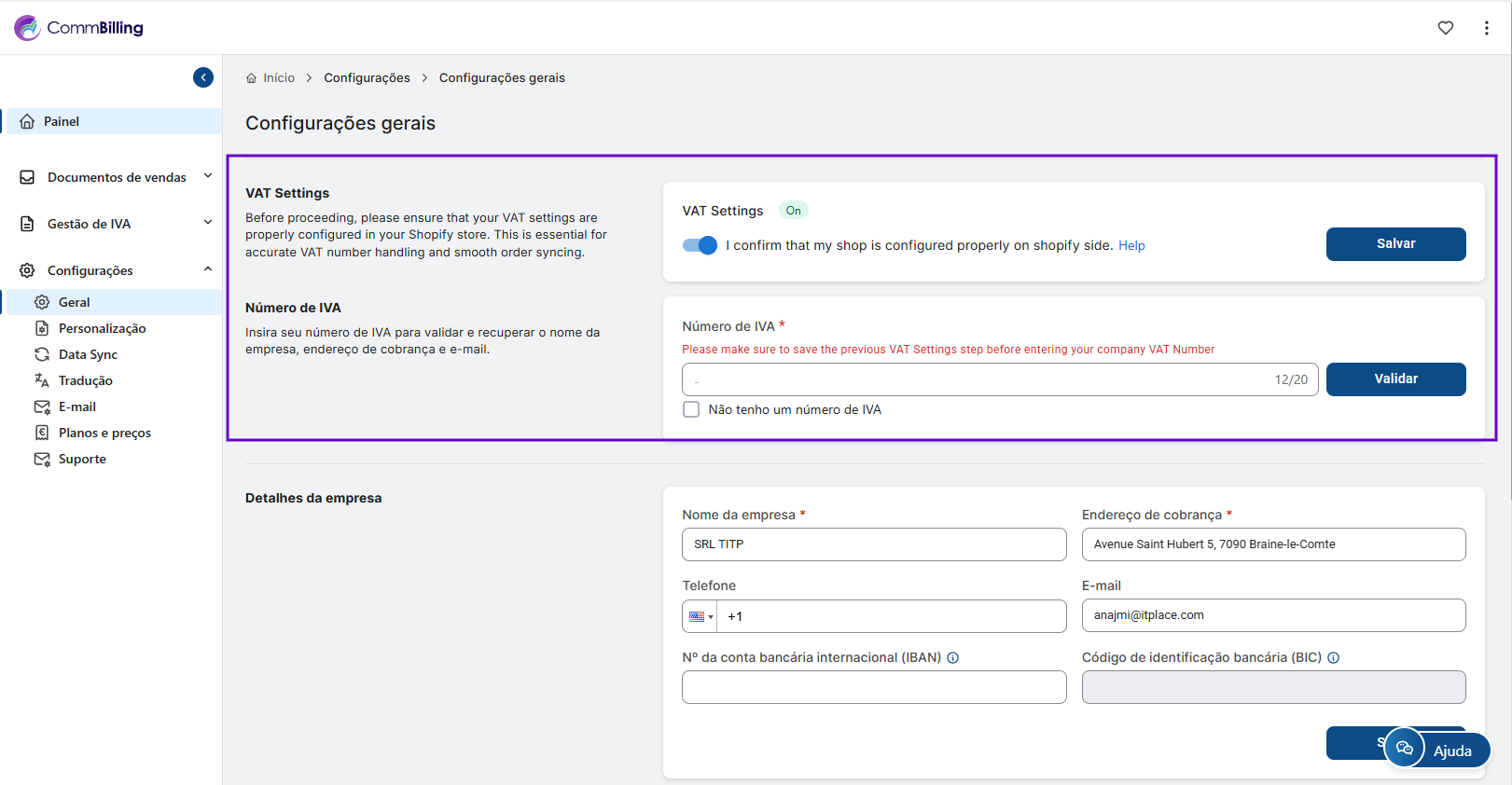 • Nesta secção, pode introduzir e validar o número de IVA da sua loja. O CommBilling verifica automaticamente a validade do número de IVA para garantir que a sua empresa permanece em conformidade com as regulamentações de IVA da UE.