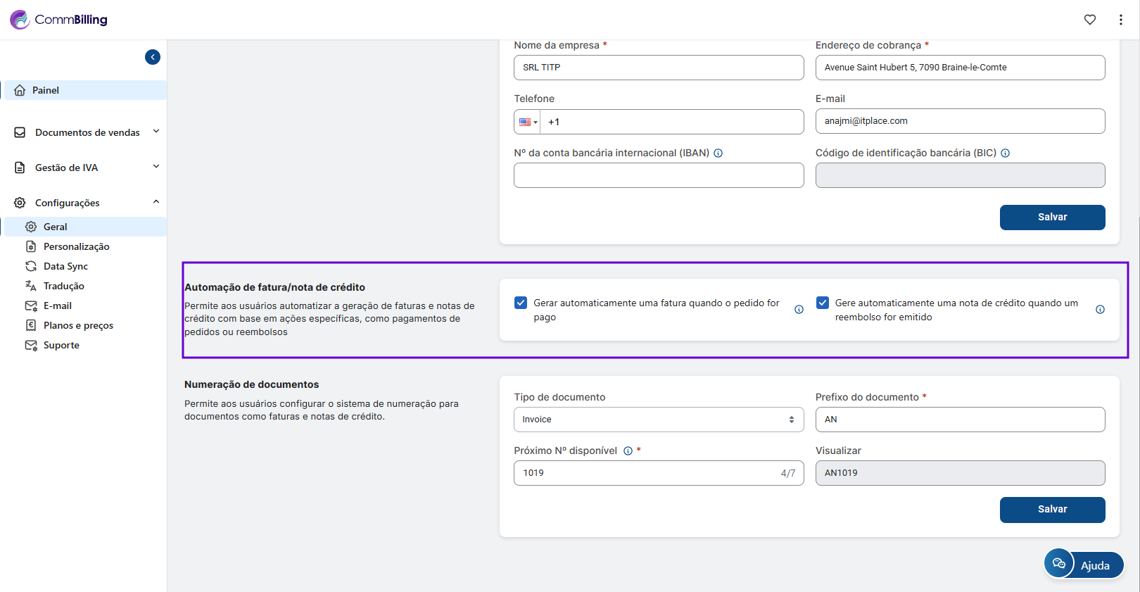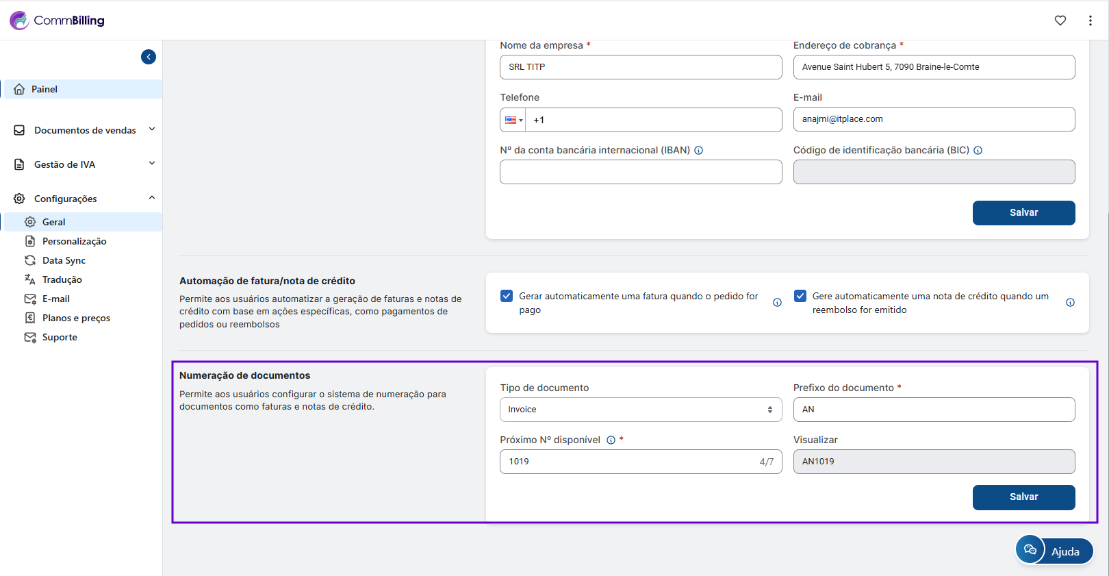 • Esta secção permite-lhe configurar o sistema de numeração para documentos como faturas e notas de crédito. Ter uma sequência de numeração clara e personalizável garante a consistência e ajuda na organização e rastreamento de documentos.
