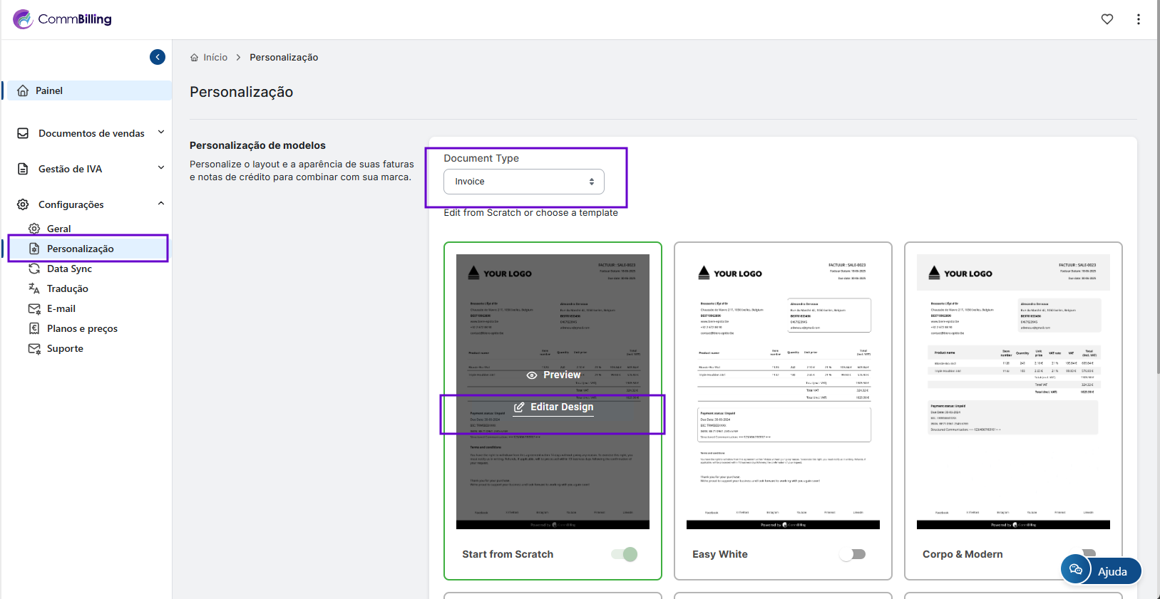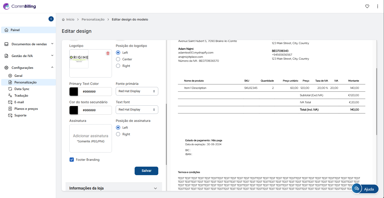 • Design de Documentos de Venda: Com base no seu plano de assinatura, pode personalizar totalmente ou não o design de faturas e notas de crédito, incluindo adicionar o logótipo da sua loja, escolher esquemas de cores e adicionar quaisquer informações adicionais, como termos e condições, remover a marca CommBilling, etc.