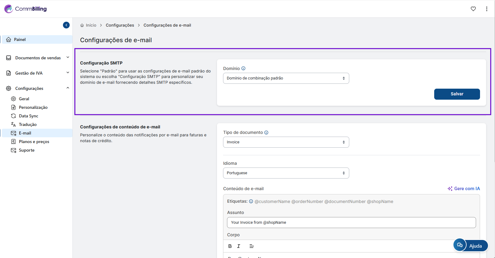 • Configuração SMTP: Dependendo do seu plano, pode utilizar o servidor SMTP do CommBilling ou configurar o seu próprio, dando-lhe controlo sobre como as faturas, notas de crédito e outras comunicações são enviadas.