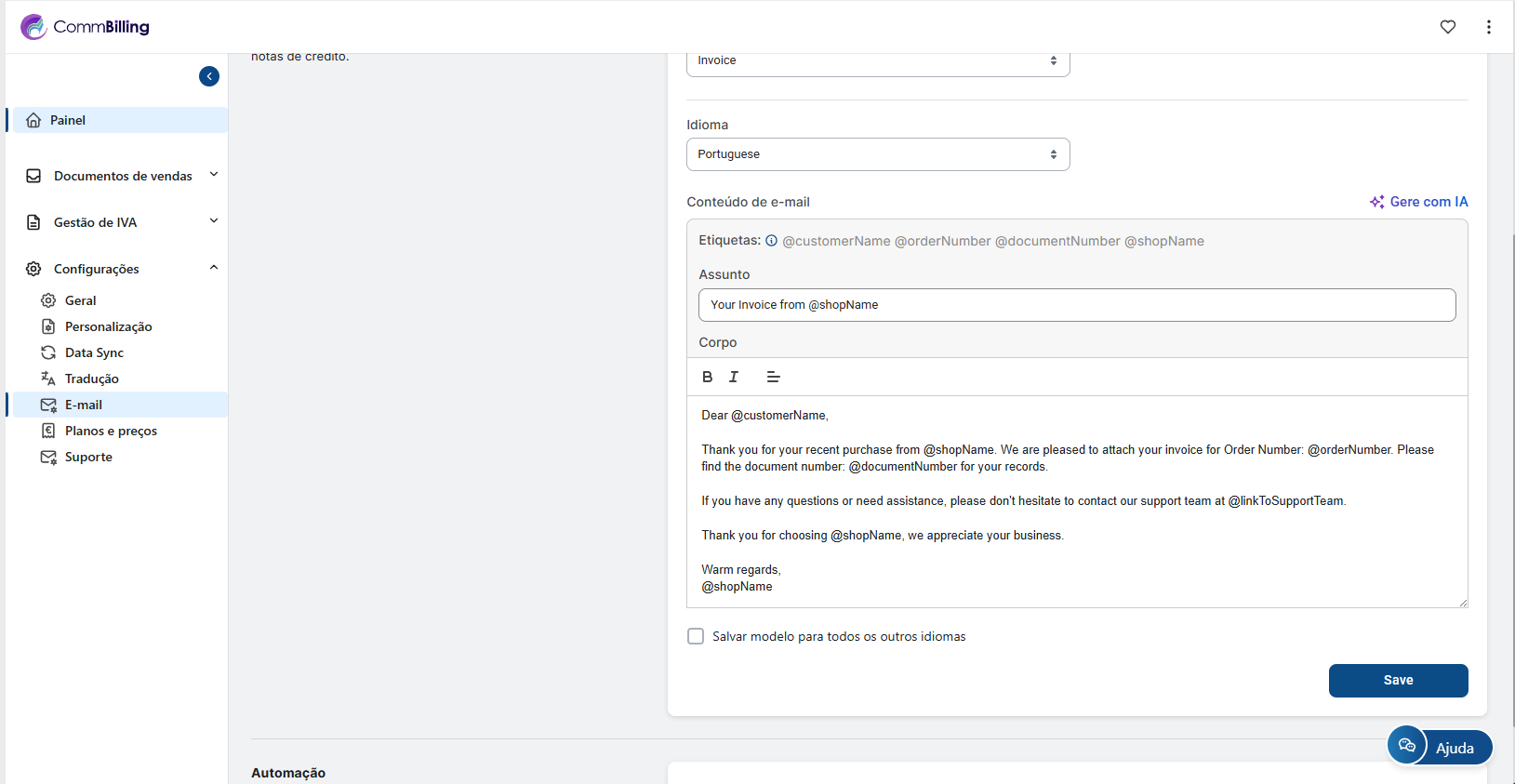 • Gerar Faturas Automaticamente: Quando ativado, o CommBilling criará automaticamente faturas para cada encomenda efetuada na sua loja Shopify.