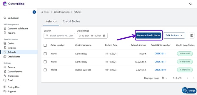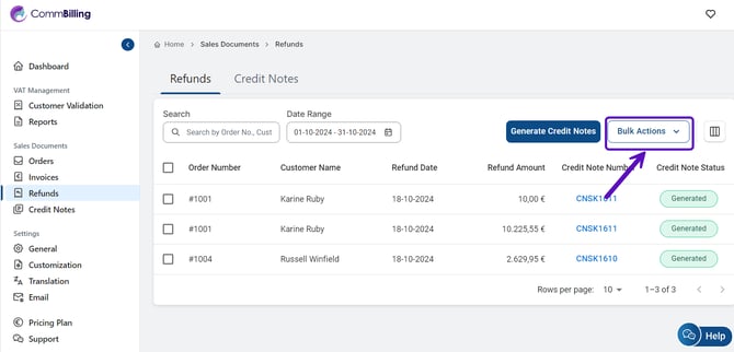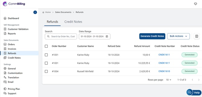CommBilling'de geri ödemeleri yönetmek ve izlemek, tüm geri ödeme işlemlerine kapsamlı bir genel bakış sağlayan özel bir Geri Ödemeler sekmesi ile basittir. Bu sekme, iade yönetimini kolaylaştırmak için arama, filtreler ve toplu eylemler gibi yararlı özellikler içerir.