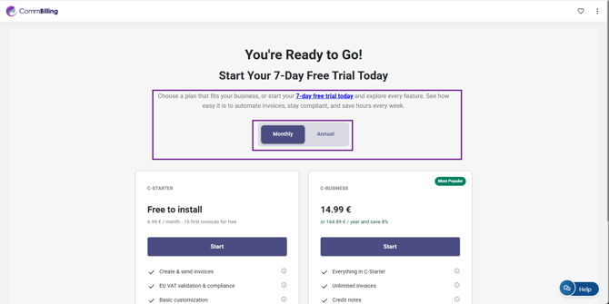 - Onboarding tamamlandıktan sonra fiyat planı sayfasına yönlendirileceksiniz. Fiyat planı seçimi, CommBilling’i kullanmaya başlamadan önce zorunludur ve yedi günlük deneme süresi her iki plan için de geçerlidir.