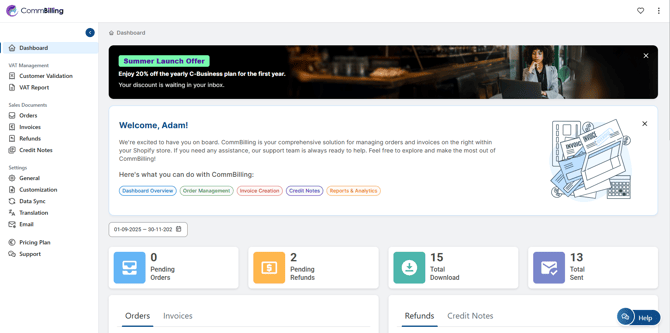 CommBilling uygulamasını doğru şekilde yapılandırmak, doğru KDV işlemesini, sorunsuz sipariş senkronizasyonunu, mevzuata uygun faturalandırmayı ve tamamen otomatik bir faturalandırma akışını garanti eder. Bu başlangıç yapılandırması, satış belgelerinizin, otomasyon kurallarınızın ve tasarım tercihlerinizi Shopify mağazanızla sorunsuz bir şekilde çalışmasını sağlamak için gereklidir.