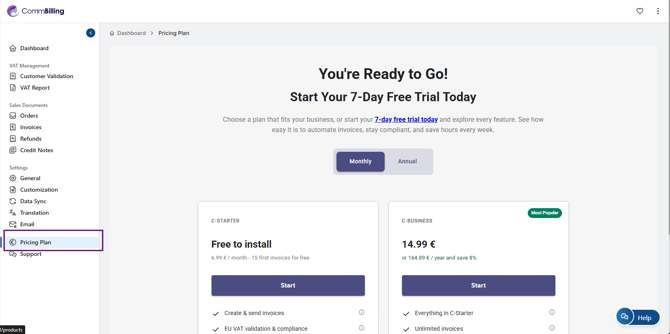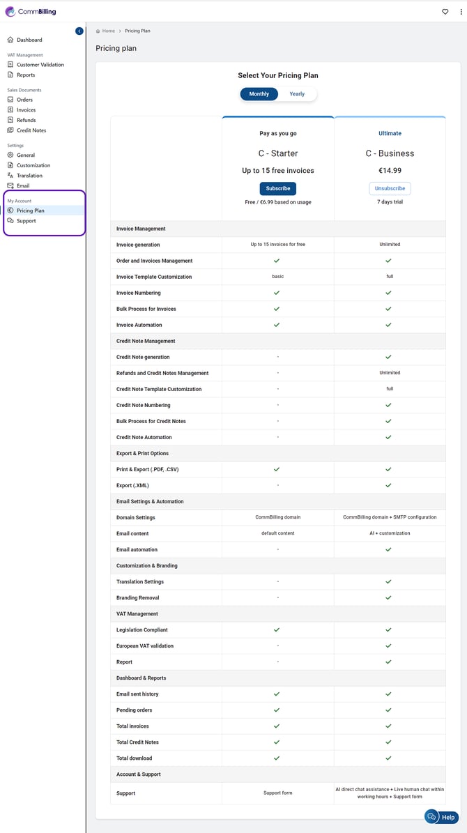 Fiyatlandırma Planı sekmesi aboneliğinizi seçmek ve yönetmek için merkezi alanınızdır. Her iki planda da sunulan yedi günlük ücretsiz deneme ile CommBilling’i güvenle keşfedebilir ve faturalama iş akışınızı ve işletme büyümenizi en iyi şekilde destekleyen planı seçebilirsiniz.