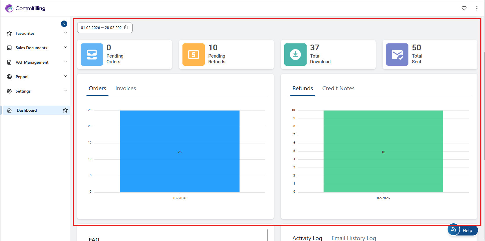 Gösterge Tablosu Sekmesini ilk açtığınızda, CommBilling'i tanıtan bir karşılama bölümü ile karşılaşacaksınız. Bu bölüm, uygulamaya ve AB vergi düzenlemeleriyle uyumlu kalmanıza nasıl yardımcı olduğuna dair hızlı bir genel bakış sağlar. Faturalama süreçlerinizin emin ellerde olduğunu bilmeniz ve verimli sipariş yönetimi için tüm özelliklere kolayca erişebilmeniz konusunda size güven vermek için tasarlanmıştır.