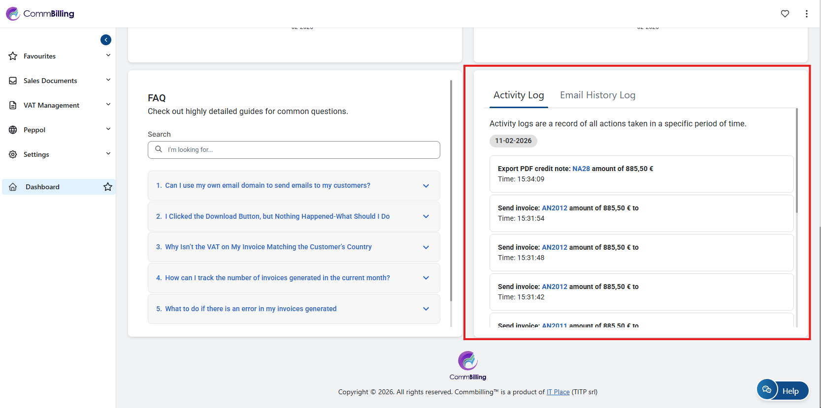 Faaliyet Günlüğü, CommBilling'de gerçekleştirilen tüm faaliyetlerin ayrıntılı bir kaydını sunar. Fatura oluşturmaktan belge şablonlarını düzenlemeye kadar her eylem günlüğe kaydedilir. Bu, hangi değişikliklerin kim tarafından yapıldığını izlemeyi kolaylaştırır ve faturalama işlemleriniz için tam görünürlük sağlar. Özellikle denetim amacıyla ve herhangi bir sorun ortaya çıkarsa eylemleri gözden geçirmek için yararlıdır.