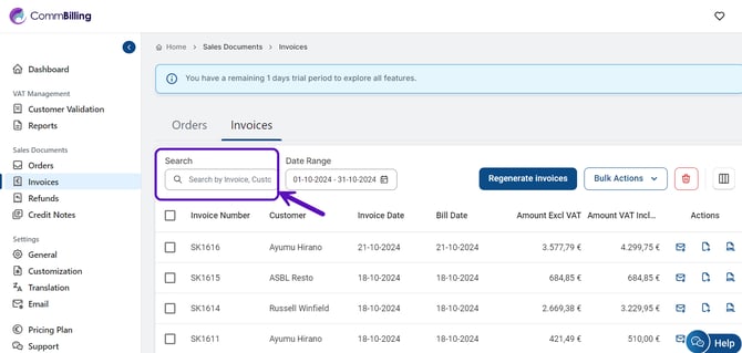 Faturalar bölümündeki arama ve tarih filtrelerini kullanarak CommBilling'de geçmiş faturaları hızlı bir şekilde bulabilir ve yönetebilirsiniz. Bu, iş akışınızı kolaylaştırmaya yardımcı olur ve önemli finansal kayıtlara kolay erişim sağlar.