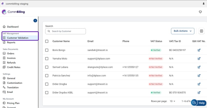 Bu bölüm müşterilerinizin KDV bilgilerini yönetmeyi kolaylaştırmak için tasarlanmıştır. Her müşteri için KDV bilgilerini manuel olarak ekleyebilir veya düzenleyebilir ve tek bir tıklamayla CommBilling KDV numarasını otomatik olarak doğrular. Sistem KDV numarasının geçerli olup olmadığını teyit eder ve bu da doğruluğu ve uyumluluğu sağlamanıza yardımcı olur.